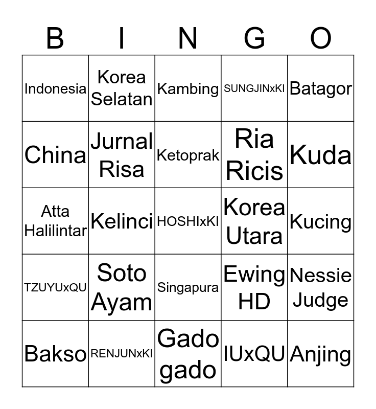 This bingo card has 25 words: Soto Ayam, Gado gado, Ketoprak, Bakso, Batagor, Indonesia, China, Korea Selatan, Korea Utara, Singapura, Ria Ricis, Atta Halilintar, Ewing HD, Nessie Judge, Jurnal Risa, Anjing, Kucing, Kambing, Kuda, Kelinci, HOSHIxKI, RENJUNxKI, TZUYUxQU, SUNGJINxKI and IUxQU.