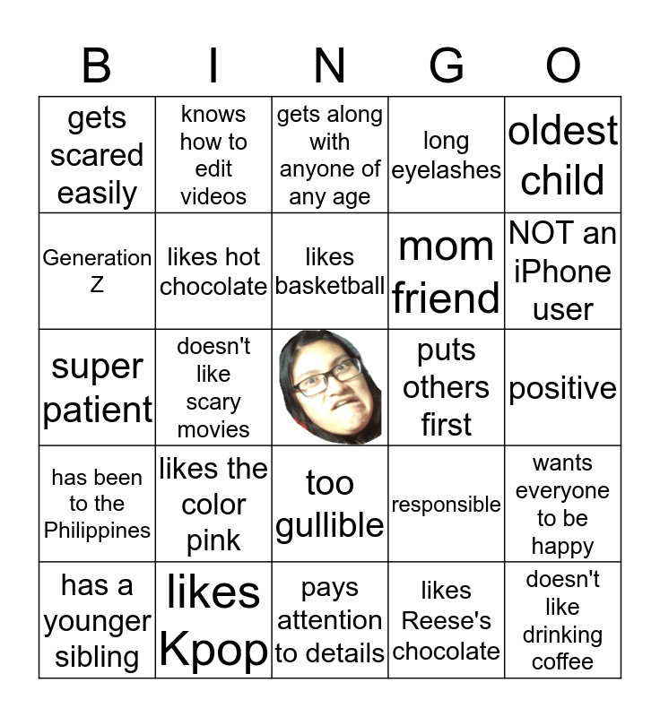 This bingo card has a free space and 24 words: likes the color pink, likes Kpop, likes basketball, has a younger sibling, oldest child, gets scared easily, Generation Z, knows how to edit videos, puts others first, too gullible, mom friend, super patient, responsible, wants everyone to be happy, likes hot chocolate, likes Reese's chocolate, positive, gets along with anyone of any age, NOT an iPhone user, doesn't like scary movies, doesn't like drinking coffee, has been to the Philippines, long eyelashes and pays attention to details.