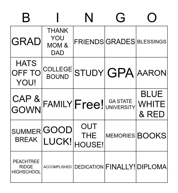 This bingo card has a free space and 29 words: PEACHTREE RIDGE HIGHSCHOOL, 2019, FAMILY, FUTURE, GRAD, FRIENDS, COLLEGE BOUND, GOOD LUCK!, GA STATE UNIVERSITY, ACCOMPLISHED, BLUE WHITE & RED, DIPLOMA, DEDICATION, FINALLY!, AARON, SUCCESS, OUT THE HOUSE!, SUMMER BREAK, BLESSINGS, CAP & GOWN, MEMORIES, CELEBRATION, GPA, HATS OFF TO YOU!, GRADES, THANK YOU MOM & DAD, BOOKS, STUDY and TEAM NO SLEEP.
