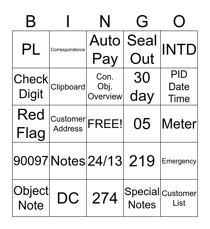 This bingo card has a free space and 93 words: TOX, 150.00, 274, Streamserve, Customer, Finder, DBA, Object Note, Positive Sign, 10, Message, Premise, LP, 30 day, Safely, INTD, Auto Pay, P424, Cre/Chg, GFB, 25.00, Cust. Serv Consultant, PO Box 24990, CIC0, Notes, Clipboard, 4/12, Green Light, Lock, Installation, DC, 24/13, Arrow Financial Services, Info Depot, Correspondence, Work Order, AMB, Have Fun!, Con. Obj. Overview, 219, Red Flag, 90097, Meter, SRI, Customer List, Blue Circle, Red Light, Contract, TP, 4/8, General, Special Notes, Analysis, Rev. Pro, PD30, Seal In, Cust. Overview, Curt Poole, Customer Contact, 900189, Customer Address, Independent, Account Display, Hammer/Wrench, 00, IV, FR, 1/83, Check Digit, Fraud/Claims Notes, Letter of Credit, 24 hours, OGE Reports, Seal Out, Ser Data, 8, PID Date Time, Emergency, Account Number, Pencil, Account Activity, Yellow Triangle, 05, PL, 35.00, Full name & Relationship, Billing Schedule, EXTD, Verification of Service, Order tab, Security Light, Essential and 10.00.