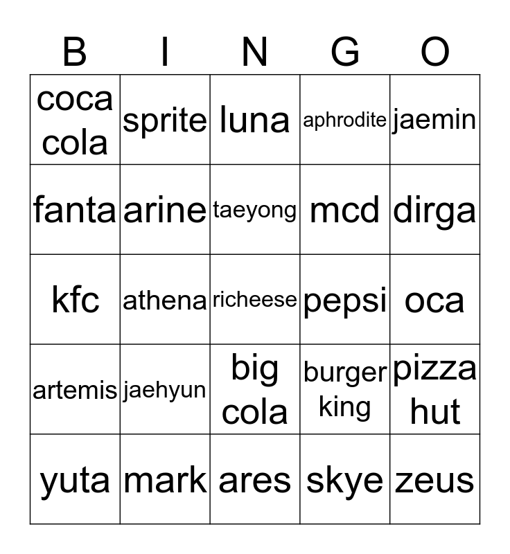 This bingo card has a free space and 24 words: jaehyun, mark, taeyong, yuta, jaemin, coca cola, fanta, sprite, pepsi, big cola, mcd, kfc, burger king, pizza hut, arine, skye, oca, luna, dirga, athena, zeus, artemis, aphrodite and ares.