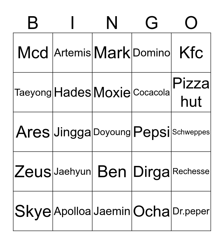 This bingo card has a free space and 24 words: Jaehyun, Apolloa, Moxie, Skye, Kfc, Mcd, Taeyong, Artemis, Pepsi, Ben, Cocacola, Ares, Dirga, Rechesse, Hades, Ocha, Schweppes, Mark, Pizza hut, Jingga, Dr.peper, Zeus, Domino and Jaemin.