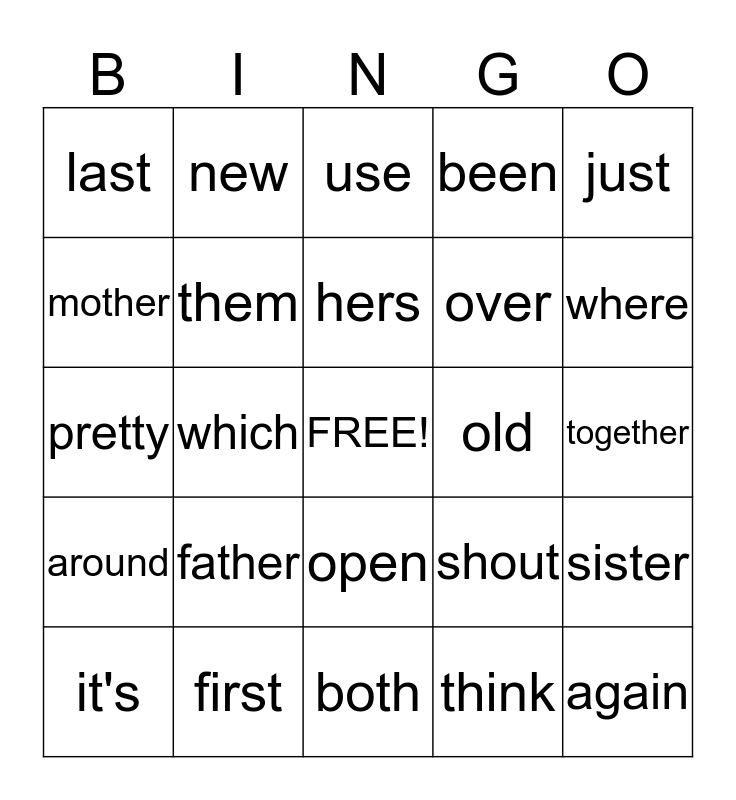 This bingo card has a free space and 24 words: father, first, hers, it's, just, last, mother, new, old, open, over, pretty, shout, sister, them, think, together, use, where, which, again, around, been and both.