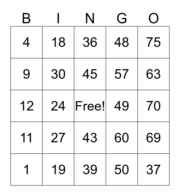 This bingo card has a free space and 24 words: 1, 27, 45, 50, 75, 4, 18, 36, 49, 70, 12, 30, 60, 69, 9, 19, 39, 48, 63, 11, 24, 43, 57 and 37.