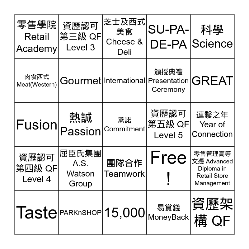 This bingo card has 27 words: Free !, 資歷架構 QF, 頒授典禮 Presentation Ceremony, 15,000, 肉食西式 Meat(Western), 芝士及西式美食 Cheese & Deli, 資歷認可第三級 QF Level 3, 資歷認可第四級 QF Level 4, 資歷認可第五級 QF Level 5, 零售管理高等文憑 Advanced Diploma in Retail Store Management, Fusion, SU-PA-DE-PA, Taste, PARKnSHOP, GREAT, Food le parc, Gourmet, International, 屈臣氏集團 A.S. Watson Group, 零售學院 Retail Academy, 連繫之年 Year of Connection, 易賞錢 MoneyBack, 熱誠 Passion, 承諾 Commitment, 團隊合作 Teamwork, 科學 Science and 創新 Innovation.