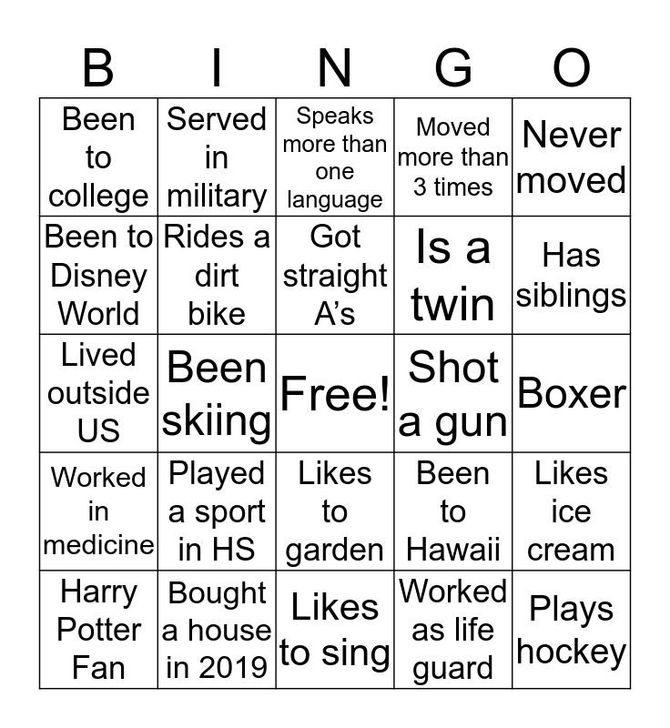 This bingo card has a free space and 24 words: Harry Potter Fan, Played a sport in HS, Got straight A’s, Worked as life guard, Never moved, Been to college, Served in military, Speaks more than one language, Shot a gun, Boxer, Lived outside US, Rides a dirt bike, Been to Hawaii, Likes ice cream, Been to Disney World, Bought a house in 2019, Likes to sing, Moved more than 3 times, Has siblings, Worked in medicine, Been skiing, Likes to garden, Is a twin and Plays hockey.