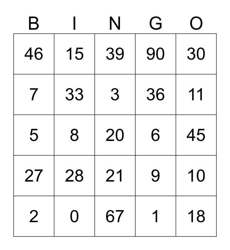 This bingo card has a free space and 24 words: 28, 0, 3, 2, 30, 46, 7, 15, 6, 21, 36, 5, 9, 10, 33, 1, 45, 39, 11, 8, 18, 27, 90 and 67.