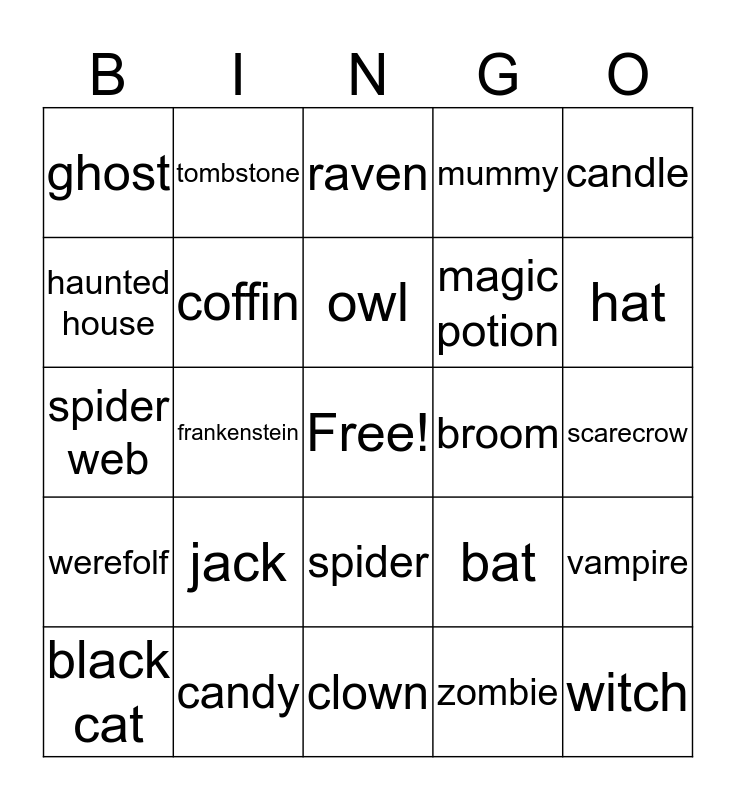 This bingo card has a free space and 24 words: jack, candy, owl, black cat, candle, ghost, haunted house, tombstone, broom, spider, magic potion, spider web, bat, vampire, coffin, zombie, scarecrow, raven, hat, frankenstein, witch, werefolf, mummy and clown.