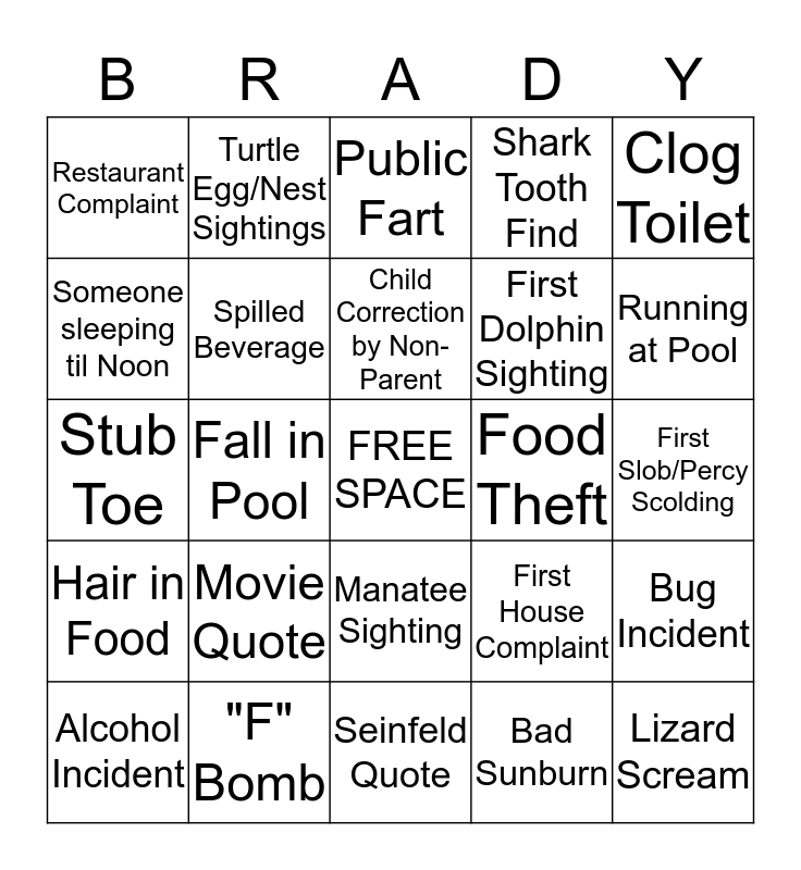 This bingo card has a free space and 29 words: Matt Giggle, "F" Bomb, Public Fart, Public Burp, Clog Toilet, Restaurant Complaint, Spilled Beverage, Child Correction by Non-Parent, Food Theft, Bug Incident, Alcohol Incident, Fall in Pool, Bad Sunburn, Lizard Scream, Stub Toe, Biff Facts, Seinfeld Quote, First House Complaint, Running at Pool, Hair in Food, Movie Quote, Knocked Down by Wave, First Dolphin Sighting, First Slob/Percy Scolding, Someone sleeping til Noon, Turtle Egg/Nest Sightings, Manatee Sighting, Shark Tooth Find and Sand Dollar Find.