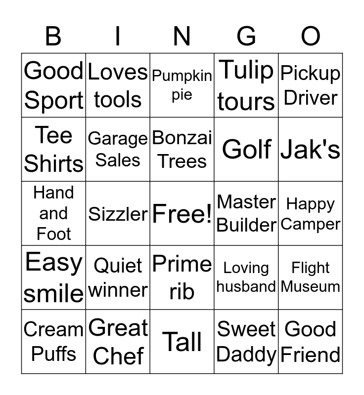 This bingo card has a free space and 24 words: Quiet winner, Great Chef, Bonzai Trees, Cream Puffs, Pickup Driver, Good Sport, Tee Shirts, Loves tools, Master Builder, Prime rib, Golf, Hand and Foot, Loving husband, Flight Museum, Garage Sales, Sweet Daddy, Happy Camper, Pumpkin pie, Jak's, Sizzler, Good Friend, Easy smile, Tulip tours and Tall.