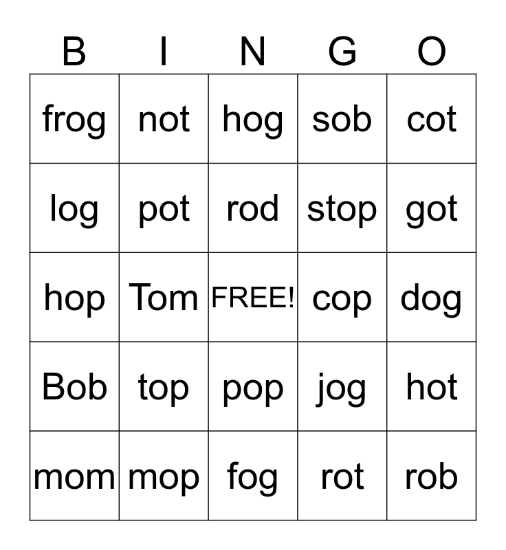This bingo card has a free space and 24 words: top, mop, rod, mom, cot, frog, log, not, cop, pop, stop, hop, jog, hot, pot, rot, dog, hog, got, Tom, rob, Bob, sob and fog.