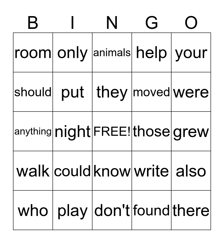 This bingo card has a free space and 24 words: could, play, they, who, your, room, should, only, those, know, moved, anything, write, also, put, found, grew, animals, were, night, there, walk, help and don't.