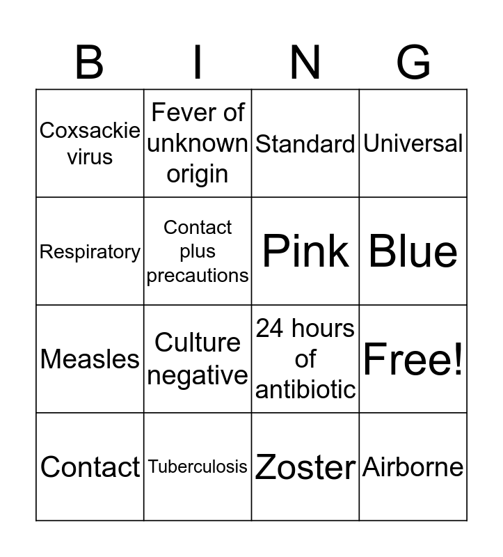 This bingo card has 20 words: Free!, Universal, Standard, Airborne, Contact, Respiratory, Tuberculosis, Coxsackie virus, Measles, Fever of unknown origin, Culture negative, 24 hours of antibiotic, Contact plus precautions, Airborne, Pink, Green, Blue, Universal, Zoster and MDRO.