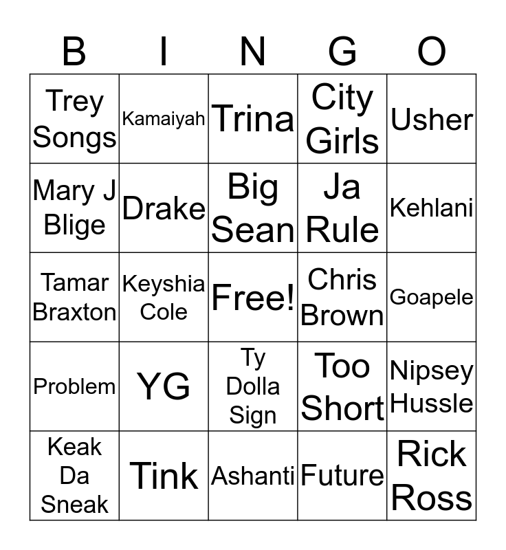 This bingo card has a free space and 49 words: Ella Mai, Rick Ross, J.Cole, Ashanti, YG, Lil Mo, Kamaiyah, Wale, Mary J Blige, Monica, Drake, City Girls, Nipsey Hussle, Too Short, 2 Chains, August Alsina, Big Sean, Chris Brown, Lloyd, Usher, Keyshia Cole, Future, Trey Songs, Ja Rule, Meek Mill, Kehlani, Keak Da Sneak, Tory Lanes, Ty Dolla Sign, Problem, Blue Face, Cardi B, Kash Doll, Queen Naija, Tink, Faith Evans, India Arie, Sunshine Anderson, Goapele, Amerie, Chingy, Eric Bellinger, Fantasia`, K. Michelle, Tamar Braxton, Trina, Tynisha Keli, Ying Yang Twins and Teedra Moses.