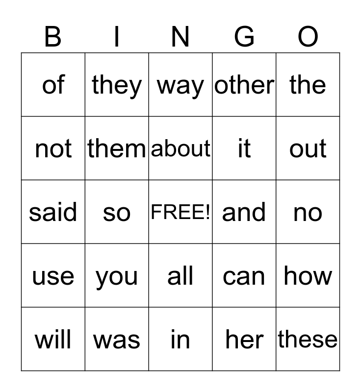 This bingo card has a free space and 24 words: you, was, about, will, the, of, not, they, and, all, it, said, can, how, them, her, no, way, out, so, these, use, other and in.
