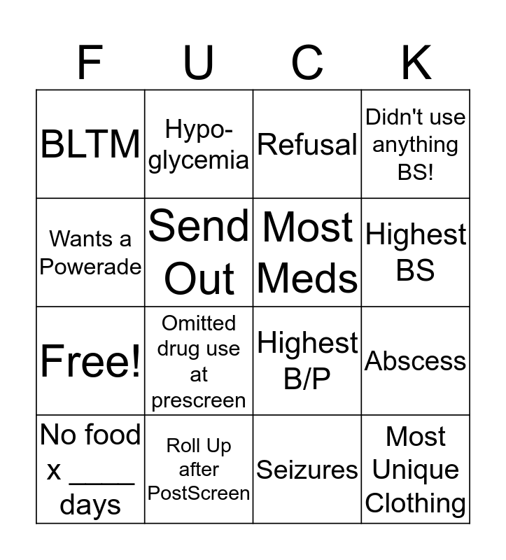 This bingo card has 20 words: No food x ____ days, On the way to the Hospital, Refusal, Abscess, AH A/O, Omitted drug use at prescreen, Seizures, Didn't use anything BS!, Free!, Hypo-glycemia, Highest B/P, Highest BS, BLTM, Roll Up after PostScreen, Most Meds, Unique Medical Issue, Wants a Powerade, Send Out, Doppel-ganger and Most Unique Clothing.