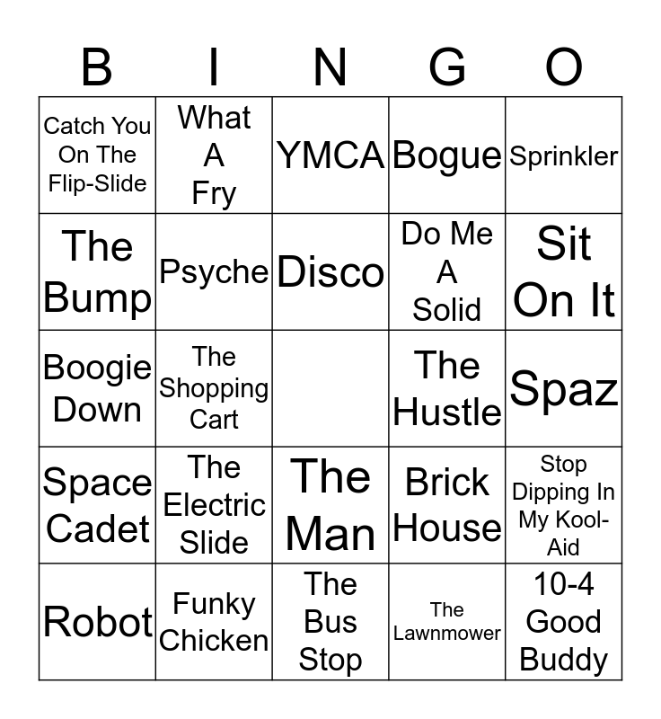This bingo card has a free space and 24 words: The Electric Slide, Funky Chicken, Disco, Robot, Sprinkler, Catch You On The Flip-Slide, The Bump, What A Fry, The Hustle, The Man, Do Me A Solid, Boogie Down, Brick House, Stop Dipping In My Kool-Aid, Psyche, The Lawnmower, Spaz, YMCA, Sit On It, The Shopping Cart, 10-4 Good Buddy, Space Cadet, Bogue and The Bus Stop.