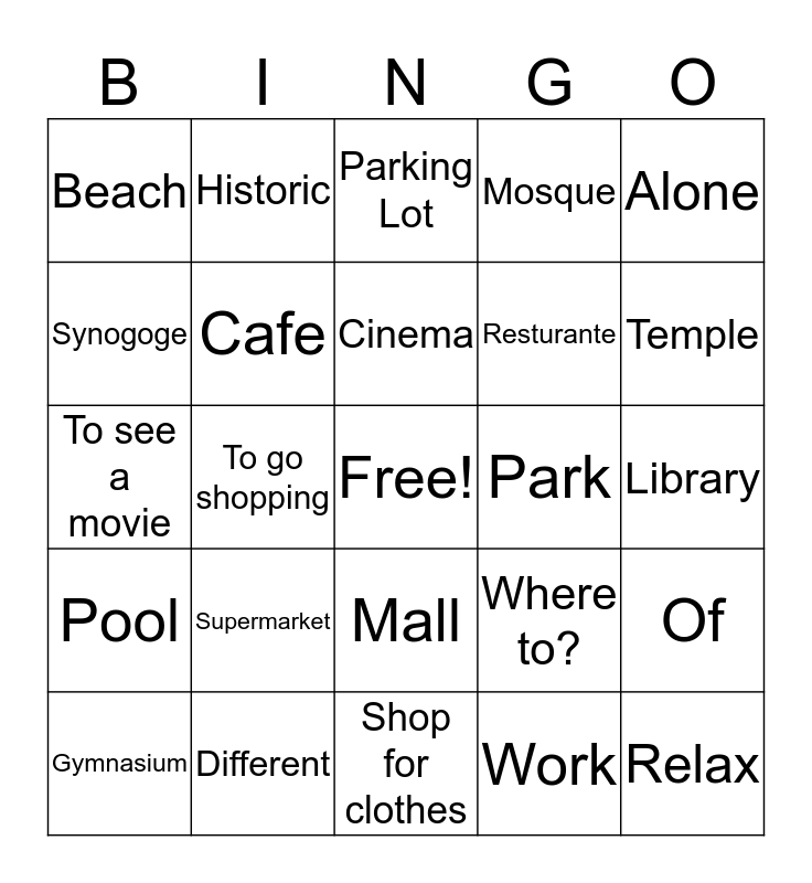 This bingo card has a free space and 29 words: Gymnasium, City, To go shopping, Piano Lesson, Beach, Parking Lot, Cafe, Supermarket, Park, Different, Library, Relax, Shop for clothes, Work, Temple, One can, Mall, Pool, Alone, To see a movie, Where to?, Home, Resturante, Synogoge, Mosque, Historic, Of, Cinema and Free time.