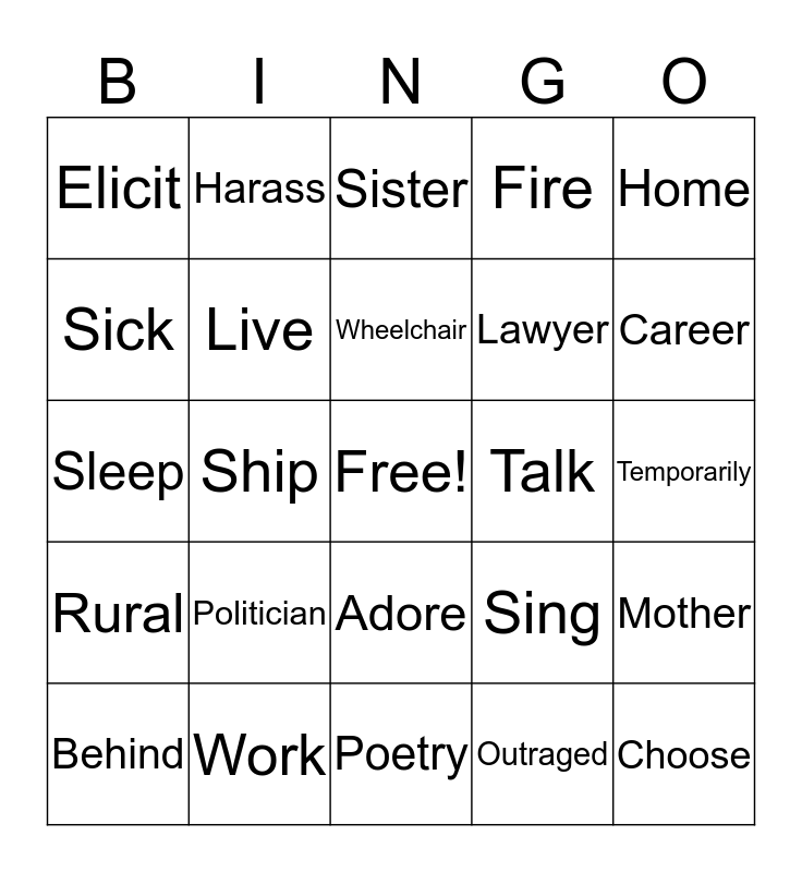 This bingo card has a free space and 67 words: Restored, Set Sail, Home, Mother, Career, Harm, Harass, Devoured, Wheelchair, Improve, Adore, Cry, Temporarily, Home, Rift, Sick, Ship, Elicit, President, Lawyer, Politician, Rural, Fire, Outraged, Read, Airplane, Clueless, Grieved, Career, Harm, Choose, Husband, Foward, Old, Set off, Behind, Temper, Sing, Sleep, Deaf, Mute, Live, Talk, Old, Harm, Work, Fly, Work, Study, Realize, Sister, War, Pen Hand, Canidate, Grief, Poetry, Daughter, Sick, Isolate, Rebellion, Walk, Ocean, Sleep, Abandon, Back, See and Sleep.