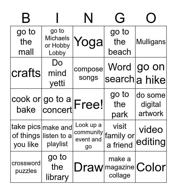 This bingo card has a free space and 29 words: crossword puzzles, watch movies, go to a concert, face time with a family member, go to the mall, Yoga, Do mind yetti, make and listen to a playlist, go to the park, go to the library, do some digital artwork, Color, Draw, make a magazine collage, go on a hike, Chores, Look up a community event and go, take pics of things you like, Mulligans, cook or bake, visit family or a friend, go for a walk, Word search, crafts, go to the beach, go to Michaels or Hobby Lobby, video editing, compose songs and bowling.