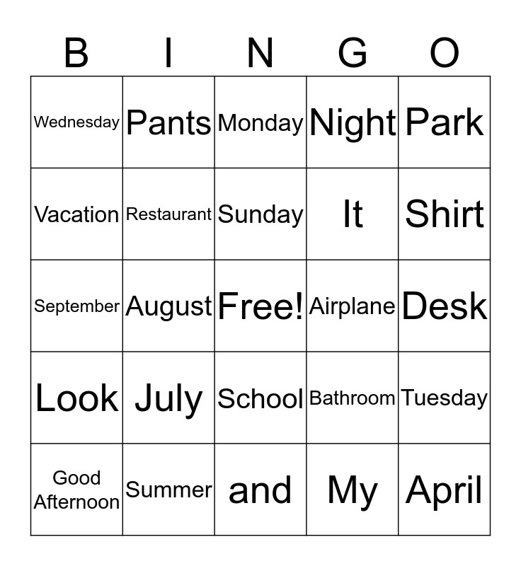 This bingo card has a free space and 24 words: Good Afternoon, July, Sunday, My, Park, Wednesday, Pants, Monday, Airplane, Desk, September, Restaurant, Bathroom, Tuesday, Vacation, Summer, and, Night, Shirt, Look, August, School, It and April.