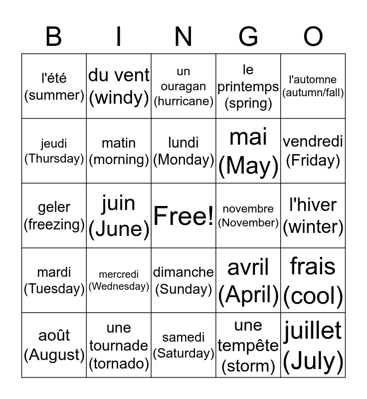 This bingo card has a free space and 39 words: janvier (January), après midi (, octobre (October), matin (morning), août (August), dimanche (Sunday), lundi (Monday), février (February), l'automne (autumn/fall), mardi (Tuesday), juin (June), le printemps (spring), juillet (July), l'hiver (winter), novembre (November), mercredi (Wednesday), mars (March), l'été (summer), septembre (September), avril (April), jeudi (Thursday), samedi (Saturday), mai (May), vendredi (Friday), chaud (hot), froid (cold), du soleil (sunny), pleuvoir (raining), neiger (snowing), du vent (windy), nuageux (cloudy), humide (humid), un ouragan (hurricane), une tournade (tornado), une tempête (storm), un éclair (lightning), frais (cool), geler (freezing) and la glace (ice).