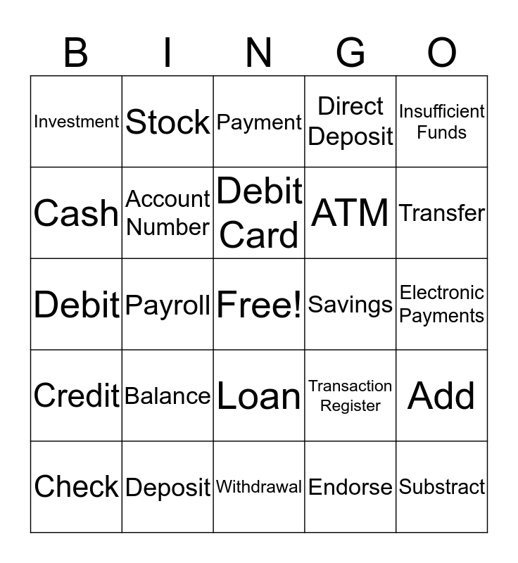 This bingo card has a free space and 24 words: Check, Balance, Debit Card, Endorse, Insufficient Funds, Investment, Stock, Payment, Savings, Electronic Payments, Debit, Account Number, Transaction Register, Add, Cash, Deposit, Withdrawal, Direct Deposit, Transfer, Credit, Payroll, Loan, ATM and Substract.