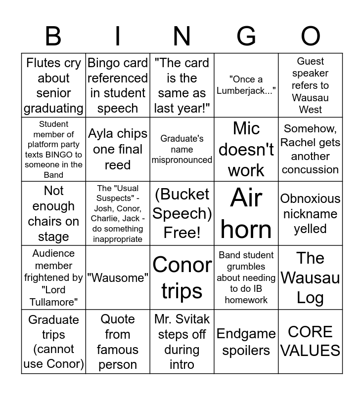 This bingo card has a free space and 24 words: "Wausome", Quote from famous person, Graduate's name mispronounced, Graduate trips (cannot use Conor), Guest speaker refers to Wausau West, Flutes cry about senior graduating, Student member of platform party texts BINGO to someone in the Band, Bingo card referenced in student speech, Air horn, Conor trips, Mic doesn't work, Not enough chairs on stage, Band student grumbles about needing to do IB homework, The Wausau Log, Ayla chips one final reed, Endgame spoilers, Obnoxious nickname yelled, "The card is the same as last year!", Somehow, Rachel gets another concussion, The "Usual Suspects" - Josh, Conor, Charlie, Jack - do something inappropriate, CORE VALUES, Audience member frightened by "Lord Tullamore", "Once a Lumberjack..." and Mr. Svitak steps off during intro.