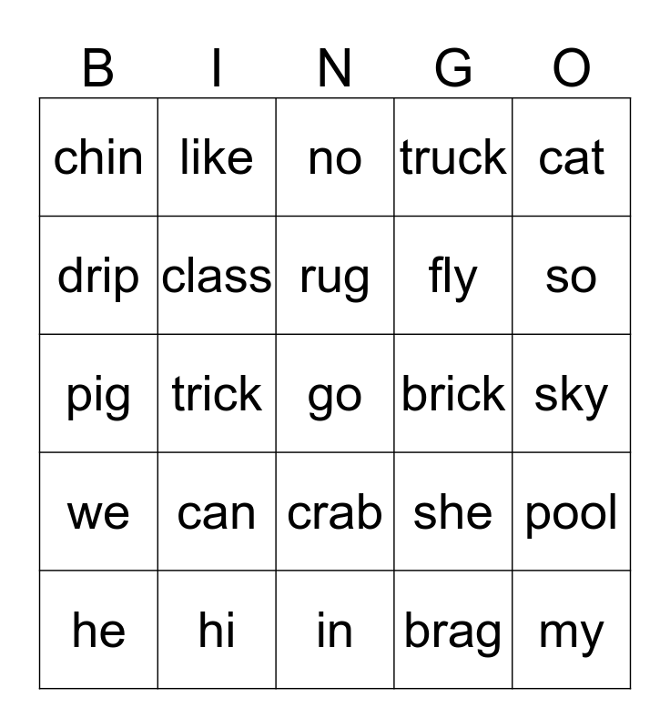 This bingo card has 35 words: skip, spin, frog, class, crab, truck, drip, bun, rug, dip, pig, cat, Free!, ship, chin, brick, brag, trick, we, go, she, he, pool, hi, no, so, my, try, fly, sky, the, in, can, like and and.