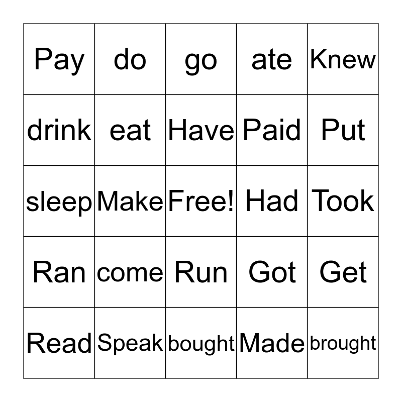 This bingo card has a free space and 48 words: bring, brought, buy, bought, come, came, do, did, drink, drank, eat, ate, Get, Got, Give, Gave, Have, Had, Know, Knew, Make, Made, Pay, Paid, Put, Put, Read, Read, Run, Ran, Say, Said, See, Saw, Speak, Spoke, Take, Took, Think, Thought, Write, Wrote, go, went, sleep, slept, sit and sat.