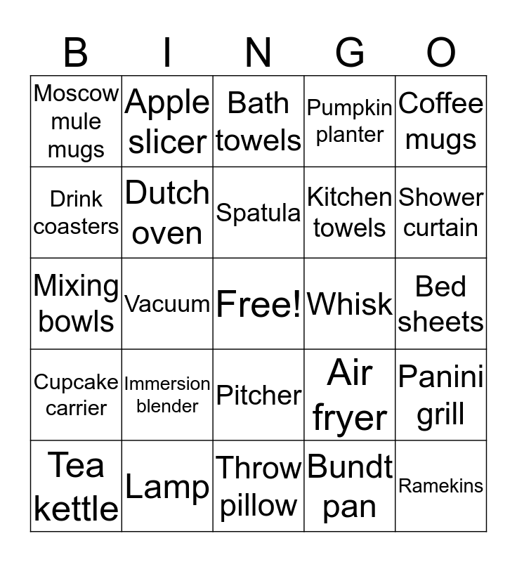 This bingo card has a free space and 24 words: Immersion blender, Lamp, Spatula, Tea kettle, Coffee mugs, Moscow mule mugs, Drink coasters, Apple slicer, Whisk, Pitcher, Kitchen towels, Mixing bowls, Air fryer, Panini grill, Dutch oven, Bundt pan, Bed sheets, Bath towels, Shower curtain, Vacuum, Ramekins, Cupcake carrier, Pumpkin planter and Throw pillow.