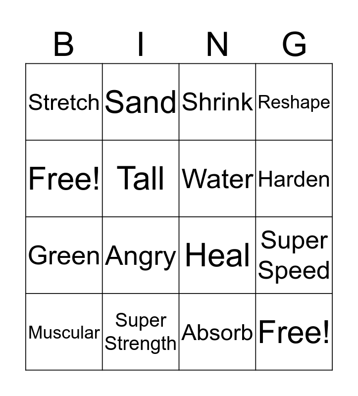 This bingo card has 16 words: Super Strength, Super Speed, Shrink, Stretch, Green, Sand, Heal, Absorb, Free!, Tall, Muscular, Reshape, Angry, Harden, Water and Free!.
