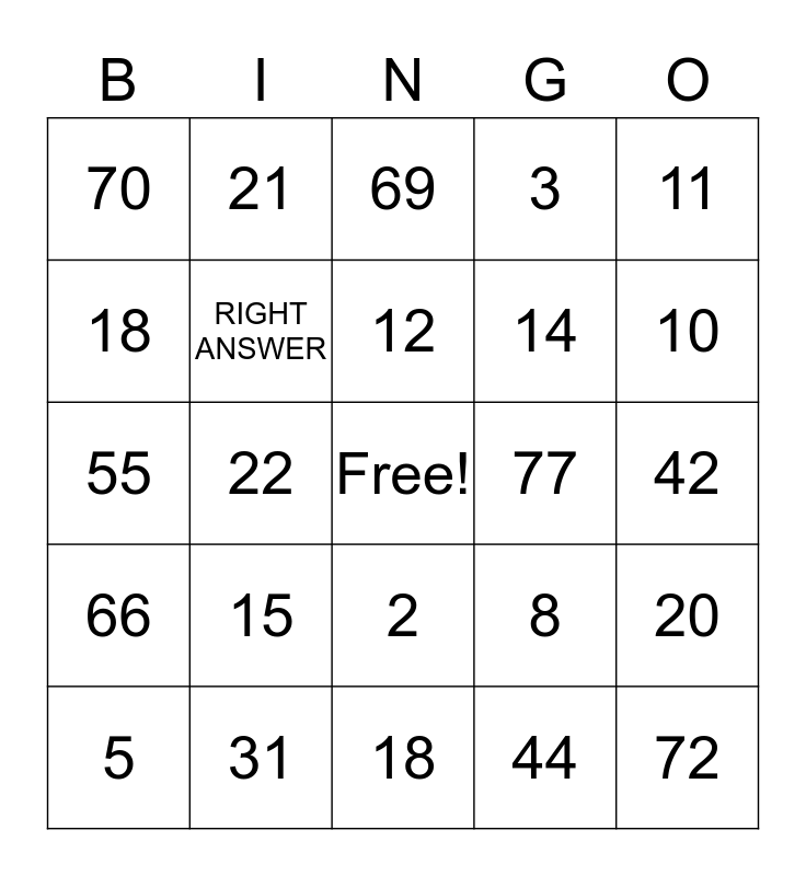 This bingo card has a free space and 26 words: 2, 44, 12, 31, 11, 70, 18, 21, 42, 8, 14, 55, 20, 5, 22, 12, 3, 66, 69, 72, 10, 18, 77, 15, RIGHT ANSWER and RIGHT ANSWER.