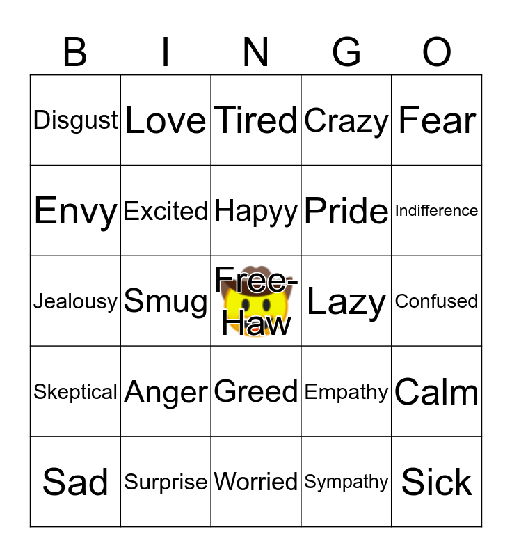 This bingo card has a free space and 24 words: Anger, Surprise, Hapyy, Sad, Fear, Disgust, Envy, Love, Lazy, Greed, Pride, Jealousy, Empathy, Calm, Excited, Sympathy, Confused, Tired, Indifference, Smug, Sick, Skeptical, Crazy and Worried.