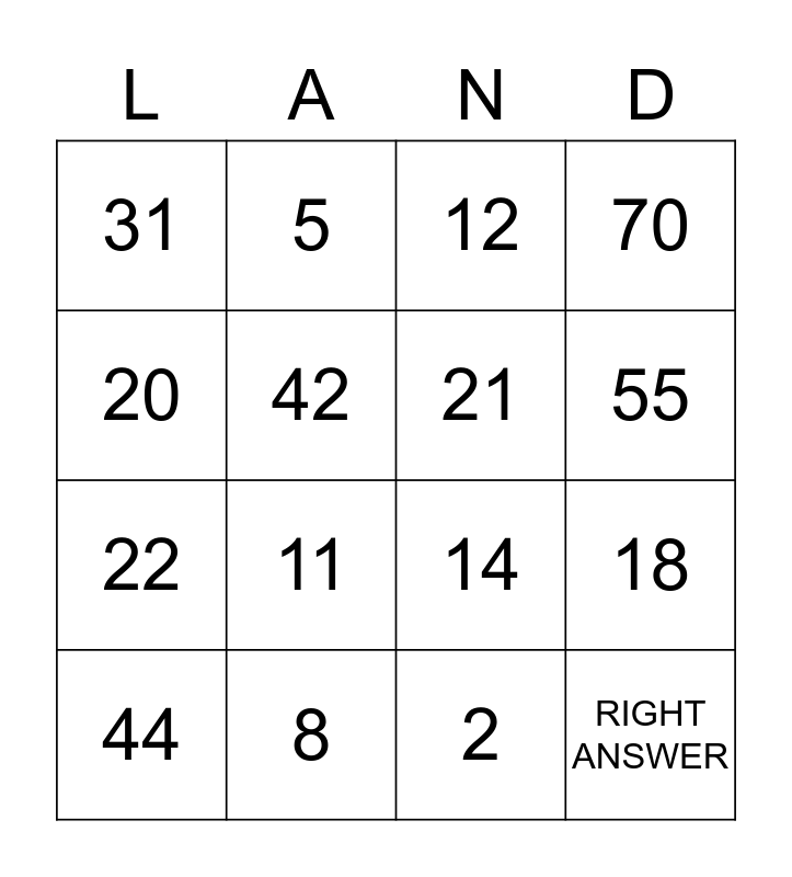 This bingo card has 17 words: 2, 44, 12, 31, 11, 70, 18, 21, 55, 42, 8, 14, 20, 5, 22, RIGHT ANSWER and RIGHT ANSWER.