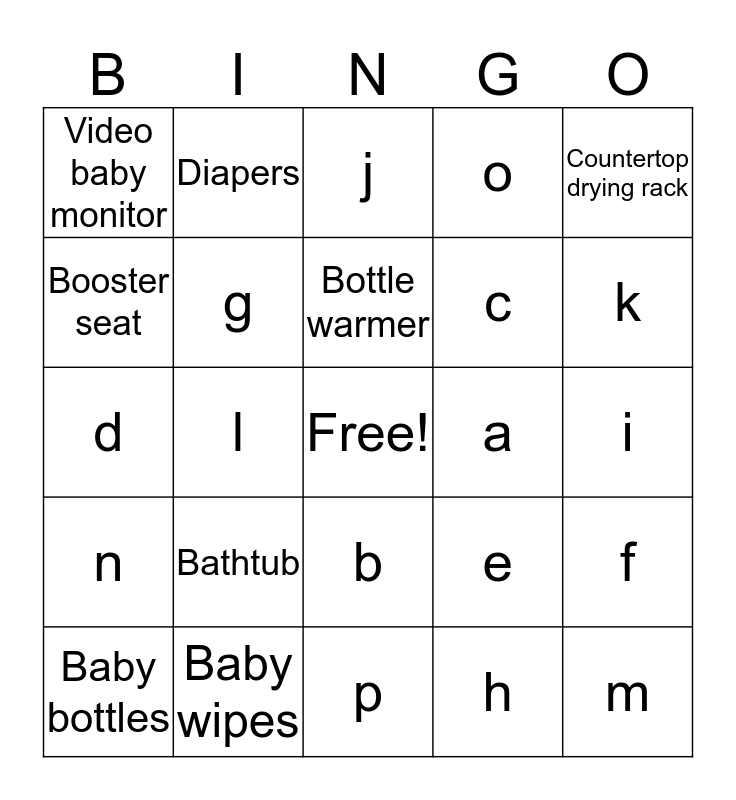 This bingo card has a free space and 24 words: Bathtub, Baby wipes, Bottle warmer, Baby bottles, Countertop drying rack, Video baby monitor, Booster seat, Diapers, a, b, c, d, e, f, g, h, i, j, k, l, m, n, o and p.