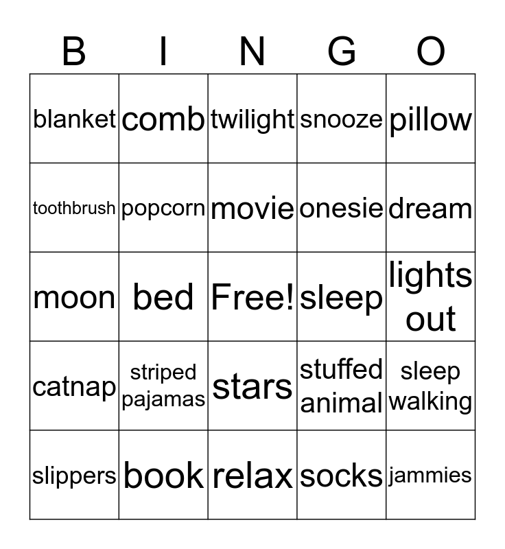 This bingo card has a free space and 24 words: striped pajamas, book, movie, slippers, pillow, blanket, toothbrush, comb, sleep, stars, onesie, moon, stuffed animal, sleep walking, popcorn, socks, lights out, twilight, dream, bed, jammies, catnap, snooze and relax.