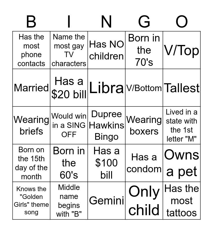 This bingo card has a free space and 24 words: Born in the 60's, Middle name begins with "B", Libra, Knows the "Golden Girls" theme song, V/Top, Has the most phone contacts, Married, Name the most gay TV characters, Wearing boxers, Has a $100 bill, V/Bottom, Wearing briefs, Has a condom, Owns a pet, Has a $20 bill, Only child, Lived in a state with the 1st letter "M", Has NO children, Tallest, Would win in a SING OFF, Has the most tattoos, Born on the 15th day of the month, Born in the 70's and Gemini.