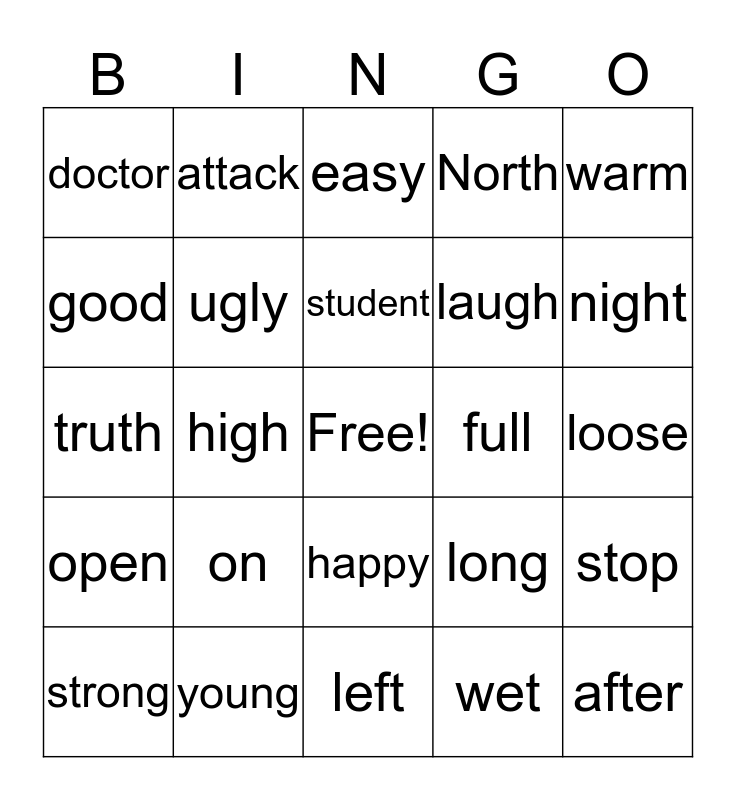 This bingo card has a free space and 24 words: on, young, student, strong, warm, doctor, good, attack, full, happy, laugh, truth, long, stop, ugly, wet, loose, easy, night, high, after, open, North and left.