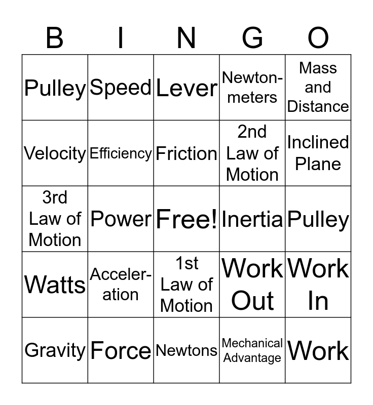 This bingo card has a free space and 24 words: Acceler-ation, Force, Friction, Gravity, Mass and Distance, Pulley, Velocity, Speed, Inertia, 1st Law of Motion, 2nd Law of Motion, 3rd Law of Motion, Work Out, Work In, Efficiency, Mechanical Advantage, Pulley, Lever, Inclined Plane, Power, Work, Watts, Newton-meters and Newtons.