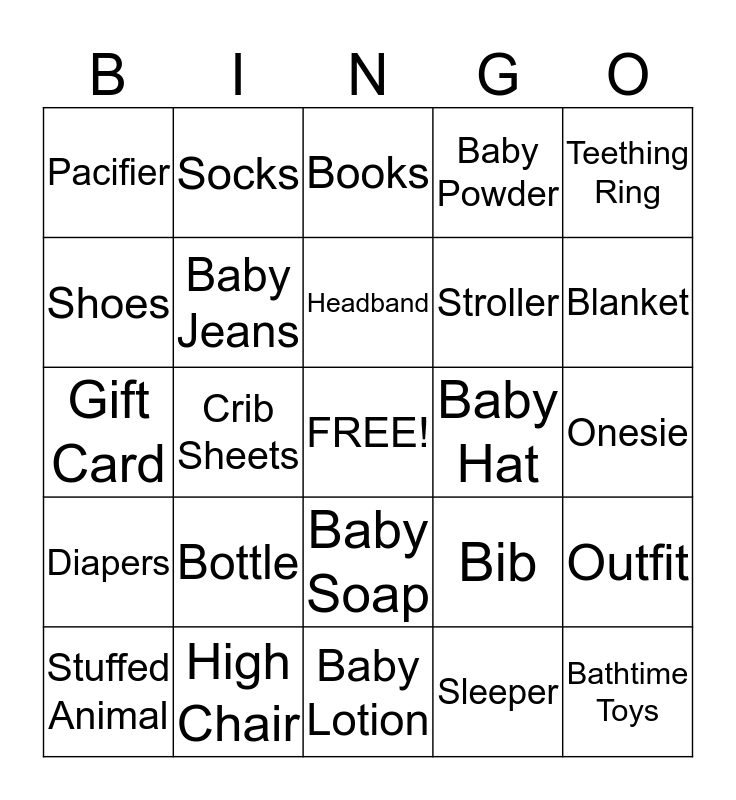This bingo card has a free space and 24 words: Bottle, High Chair, Headband, Stuffed Animal, Teething Ring, Pacifier, Shoes, Socks, Baby Hat, Baby Soap, Stroller, Gift Card, Bib, Outfit, Baby Jeans, Sleeper, Onesie, Books, Blanket, Crib Sheets, Bathtime Toys, Diapers, Baby Powder and Baby Lotion.