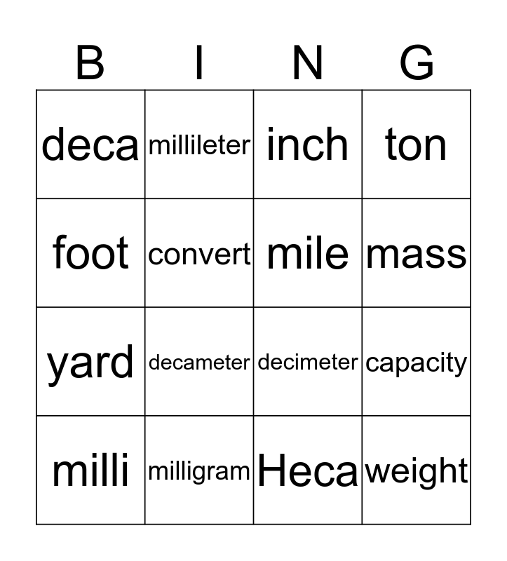 This bingo card has 16 words: milligram, capacity, inch, deca, yard, millileter, decimeter, Heca, foot, convert, milli, ton, decameter, mass, mile and weight.