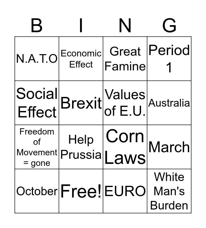 This bingo card has 24 words: Theresa May, E.U., Australia, Triple Entente, Social Effect, N.A.T.O, Brexit, Economic Effect, Free!, Navigation Acts, Freedom of Movement = gone, Corn Laws, Utrecht, MCKAY, Values of E.U., Weak Housing Market, EURO, Great Famine, Help Prussia, March, October, White Man's Burden, Period 1 and Colony.