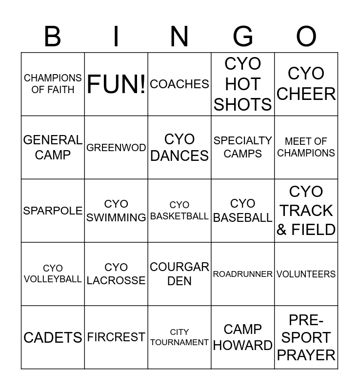 This bingo card has 40 words: SISTER KRISTA, SPARPOLE, ALDERWOOD, GREENWOD, FIRCREST, COURGAR DEN, CYO DANCES, CYO FOOTBALL, CYO CHEER, CYO VOLLEYBALL, CYO SWIMMING, CYO HOT SHOTS, CYO BASKETBALL, CYO TRACK & FIELD, CYO BASEBALL, CYO LACROSSE, GALEN RUPP, CHAMPIONS OF FAITH, THANK YOU, COACHES, VOLUNTEERS, CAMP HOWARD, SPECIALTY CAMPS, GENERAL CAMP, ATHLETIC DIRECTORS, COMMISSIONS, EXECUTIVE BOARD, RULES & COMPLIANCE, PRE-SPORT PRAYER, SPORTS MANUAL, CUBS, CADETS, POLLIWOG, ROADRUNNER, MEET OF CHAMPIONS, CITY TOURNAMENT, SPIKE TOURNAMNET, HIGH SCHOOL BASKETBALL, FUN! and MAKING GREAT MEMORIES.