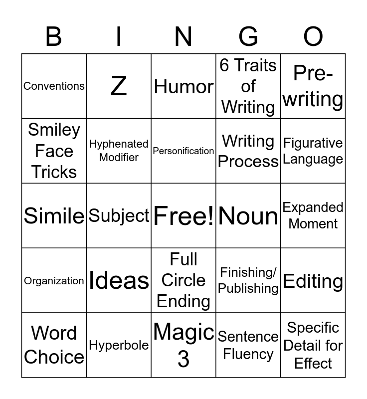 This bingo card has a free space and 31 words: Magic 3, Repetition for Effect, Subject, Predicate, Conventions, Humor, Hyphenated Modifier, Finishing/ Publishing, Noun, Sentence Fluency, Expanded Moment, Specific Detail for Effect, Verb, Voice, Figurative Language, Revising, Editing, Ideas, Organization, Full Circle Ending, Pre-writing, Drafting, Word Choice, Z, Writing Process, Smiley Face Tricks, 6 Traits of Writing, Simile, Hyperbole, Personification and Idiom.