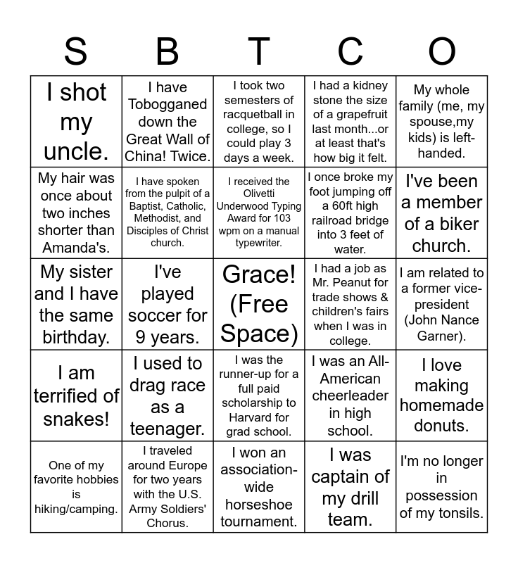 This bingo card has a free space and 24 words: I used to drag race as a teenager., I traveled around Europe for two years with the U.S. Army Soldiers' Chorus., I received the Olivetti Underwood Typing Award for 103 wpm on a manual typewriter., One of my favorite hobbies is hiking/camping., My whole family (me, my spouse,my kids) is left-handed., I shot my uncle., My hair was once about two inches shorter than Amanda's., I have Tobogganed down the Great Wall of China! Twice., I had a job as Mr. Peanut for trade shows & children's fairs when I was in college., I was the runner-up for a full paid scholarship to Harvard for grad school., I once broke my foot jumping off a 60ft high railroad bridge into 3 feet of water., My sister and I have the same birthday., I was an All-American cheerleader in high school., I love making homemade donuts., I have spoken from the pulpit of a Baptist, Catholic, Methodist, and Disciples of Christ church., I was captain of my drill team., I am related to a former vice-president (John Nance Garner)., I took two semesters of racquetball in college, so I could play 3 days a week., I've been a member of a biker church., I've played soccer for 9 years., I'm no longer in possession of my tonsils., I am terrified of snakes!, I had a kidney stone the size of a grapefruit last month...or at least that's how big it felt. and I won an association-wide horseshoe tournament..