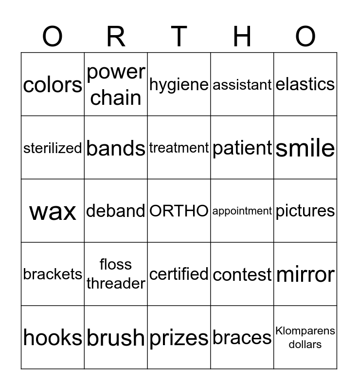 This bingo card has a free space and 34 words: Invisalign, braces, manatee, wires, brackets, bands, elastics, hooks, power chain, o-ring, treatment, hygiene, teeth, retainers, appointment, smile, brush, wax, floss threader, contest, certified, impressions, colors, pictures, prizes, Klomparens dollars, assistant, Doctor, patient, sterilized, color wheel, deband, mirror and flossing.