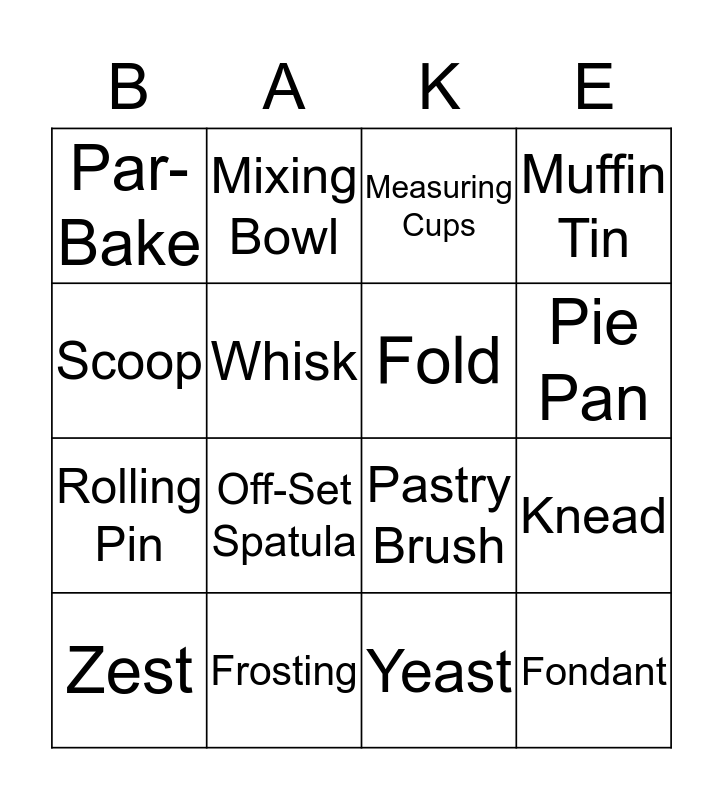 This bingo card has 28 words: Cookies, Cake, Rolling Pin, Pastry Cutter, Whisk, Measuring Cups, Mixing Bowl, Fondant, Frosting, Baking Sheet, Pastry Brush, Muffin Tin, Cupcake, Parchment Paper, Off-Set Spatula, Cupcake Liner, Blend, Fold, Pie Pan, Croissant, Par-Bake, Cookie Cutter, Zest, Knead, Yeast, Hand Pies, Scoop and Luster Dust.