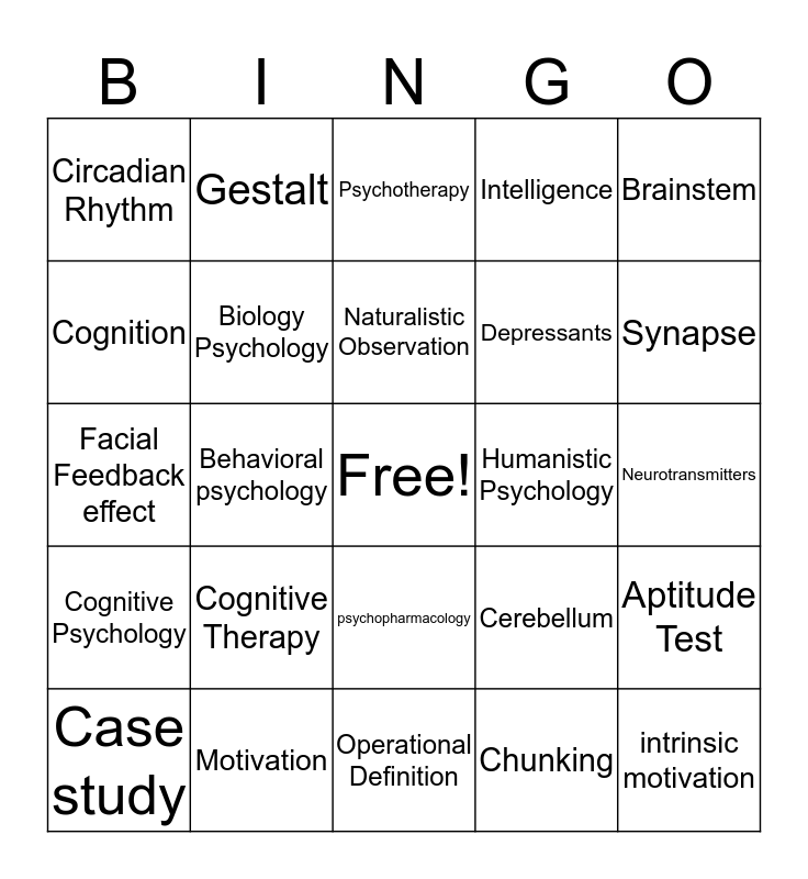 This bingo card has a free space and 28 words: Aptitude Test, Achievement test, Depressants, Chunking, Cognition, Psychotherapy, Gestalt, Cognitive Psychology, Humanistic Psychology, Case study, Facial Feedback effect, Intelligence, Motivation, Operational Definition, Synapse, Psychology, Cognitive Therapy, Biology Psychology, Naturalistic Observation, psychopharmacology, Circadian Rhythm, operant conditioning, intrinsic motivation, Behavioral psychology, Neurotransmitters, Cerebellum, Brainstem and Heuristic.
