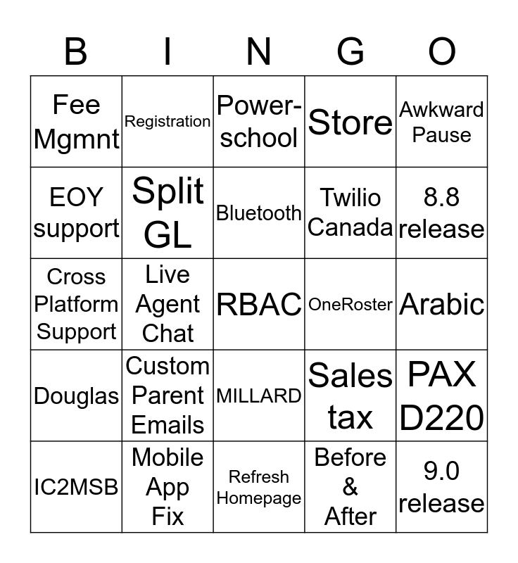This bingo card has 30 words: Mobile App Fix, MSBA, Live Agent Chat, Invoicing API, Fee Mgmnt, Power- school, Split GL, MILLARD, OneRoster, Refresh Homepage, Arabic, RBAC, Before & After, 9.0 release, 8.8 release, Invoice non-students, Sales tax, Douglas, Custom Parent Emails, Awkward Pause, Cross Platform Support, QR Codes, Registration, Twilio Canada, EOY support, Store, PAX D220, IC2MSB, Bluetooth and Progress-Book Intergrate.